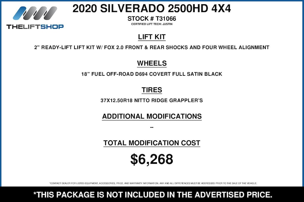 At Lifted Trucks, transparency is our priority. While we strive to provide accurate descriptions of our vehicles, please understand that errors may occur due to the human element involved in the process. All advertised vehicles are subject to actual dealer availability. Certain vehicles listed may not be available, or may have different prices. Prices exclude state tax, license, document preparation fee, smog fee, and finance charges, if applicable. Vehicle options and pricing are subject to change. Prices include all dealer rebates and dealer incentives. Pricing and availability varies by dealership. Please check with your dealer for more information. The dealer is not responsible for specific accessories or options that came with the vehicle when sold new, some of these options might pull from the vin number and be listed on our website, but what you see in the photos is what the vehicle will come with, nothing additional. Images displayed may not be representative of the actual trim level of a vehicle. Colors shown are the most accurate representations available. However, due to the limitations of web and monitor color display, we cannot guarantee that the colors depicted will exactly match the color of the car. Information provided is believed accurate but all specifications, pricing, and availability must be confirmed in writing (directly) with the dealer to be binding. Neither the Dealer nor Dealer.com is responsible for any inaccuracies contained herein and by using this application you the customer acknowledge the foregoing and accept such terms.