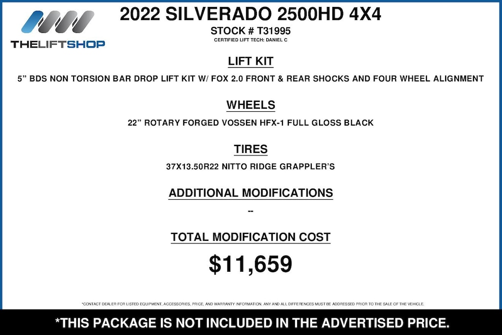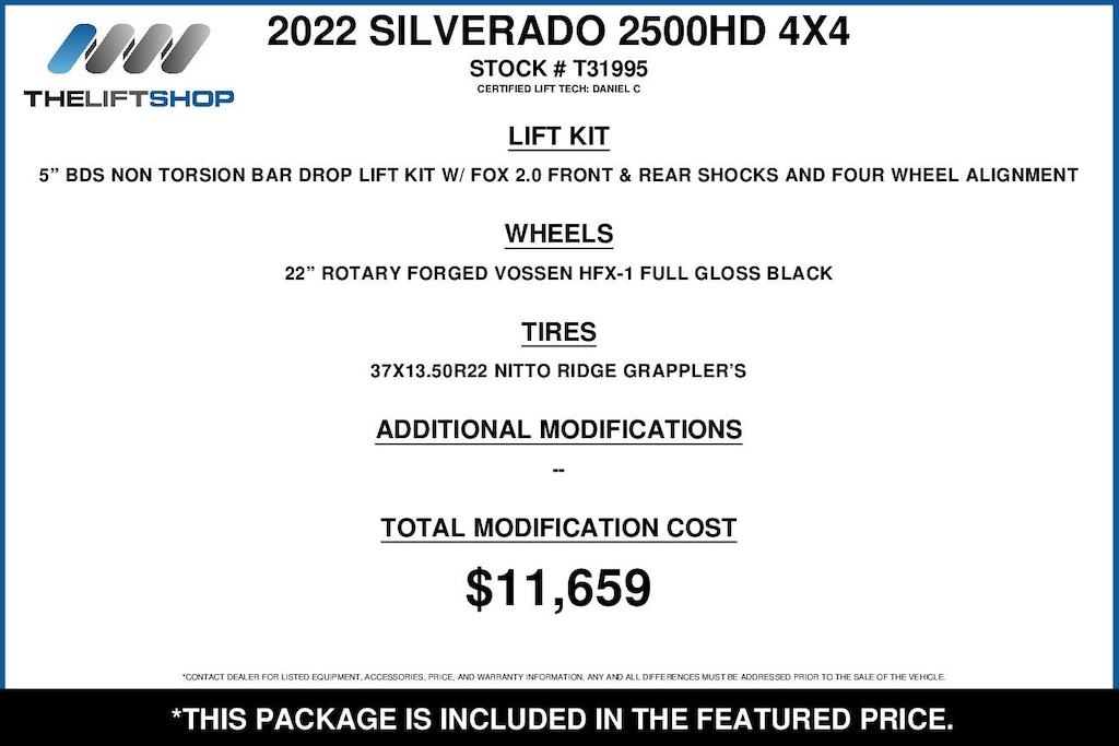 At Lifted Trucks, transparency is our priority. While we strive to provide accurate descriptions of our vehicles, please understand that errors may occur due to the human element involved in the process. All advertised vehicles are subject to actual dealer availability. Certain vehicles listed may not be available, or may have different prices. Prices exclude state tax, license, document preparation fee, smog fee, and finance charges, if applicable. Vehicle options and pricing are subject to change. Prices include all dealer rebates and dealer incentives. Pricing and availability varies by dealership. Please check with your dealer for more information. The dealer is not responsible for specific accessories or options that came with the vehicle when sold new, some of these options might pull from the vin number and be listed on our website, but what you see in the photos is what the vehicle will come with, nothing additional. Images displayed may not be representative of the actual trim level of a vehicle. Colors shown are the most accurate representations available. However, due to the limitations of web and monitor color display, we cannot guarantee that the colors depicted will exactly match the color of the car. Information provided is believed accurate but all specifications, pricing, and availability must be confirmed in writing (directly) with the dealer to be binding. Neither the Dealer nor Dealer.com is responsible for any inaccuracies contained herein and by using this application you the customer acknowledge the foregoing and accept such terms.
