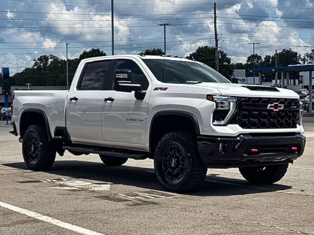 Backed by bold Diesel power, our One Owner and Clean Carfax 2025 Chevrolet Silverado 2500 ZR2 Crew Cab 4X4 with the Technology Pack takes on big tasks even on rugged terrain in Summit White! Featuring a TurboCharged 6.6 Liter DuraMax Diesel V8 serving up 470hp and 975lb-ft of torque to a 10 Speed Allison Automatic transmission engineered to stand up to off-road use. This Four Wheel Drive truck also gets a notable trail advantage from its lifted high-performance suspension with Multimatic DSSV dampers. The raised ride height enhances our Silverado 2500's aggressive style, too. The look complements LED lighting, gloss-black wheels, a sunroof, ZR2 skid plates, running boards, a power up/down tailgate, roof-marker lights, and a spray-on bedliner.