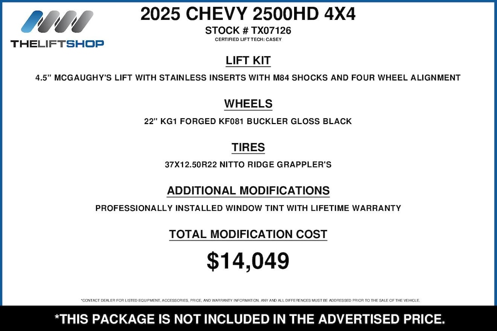 At Lifted Trucks, transparency is our priority. While we strive to provide accurate descriptions of our vehicles, please understand that errors may occur due to the human element involved in the process. All advertised vehicles are subject to actual dealer availability. Certain vehicles listed may not be available, or may have different prices. Prices exclude state tax, license, document preparation fee, smog fee, and finance charges, if applicable. Vehicle options and pricing are subject to change. Prices include all dealer rebates and dealer incentives. Pricing and availability varies by dealership. Please check with your dealer for more information. The dealer is not responsible for specific accessories or options that came with the vehicle when sold new, some of these options might pull from the vin number and be listed on our website, but what you see in the photos is what the vehicle will come with, nothing additional. Images displayed may not be representative of the actual trim level of a vehicle. Colors shown are the most accurate representations available. However, due to the limitations of web and monitor color display, we cannot guarantee that the colors depicted will exactly match the color of the car. Information provided is believed accurate but all specifications, pricing, and availability must be confirmed in writing (directly) with the dealer to be binding. Neither the Dealer nor Dealer.com is responsible for any inaccuracies contained herein and by using this application you the customer acknowledge the foregoing and accept such terms.