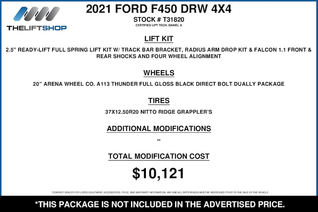 At Lifted Trucks, transparency is our priority. While we strive to provide accurate descriptions of our vehicles, please understand that errors may occur due to the human element involved in the process. All advertised vehicles are subject to actual dealer availability. Certain vehicles listed may not be available, or may have different prices. Prices exclude state tax, license, document preparation fee, smog fee, and finance charges, if applicable. Vehicle options and pricing are subject to change. Prices include all dealer rebates and dealer incentives. Pricing and availability varies by dealership. Please check with your dealer for more information. The dealer is not responsible for specific accessories or options that came with the vehicle when sold new, some of these options might pull from the vin number and be listed on our website, but what you see in the photos is what the vehicle will come with, nothing additional. Images displayed may not be representative of the actual trim level of a vehicle. Colors shown are the most accurate representations available. However, due to the limitations of web and monitor color display, we cannot guarantee that the colors depicted will exactly match the color of the car. Information provided is believed accurate but all specifications, pricing, and availability must be confirmed in writing (directly) with the dealer to be binding. Neither the Dealer nor Dealer.com is responsible for any inaccuracies contained herein and by using this application you the customer acknowledge the foregoing and accept such terms.