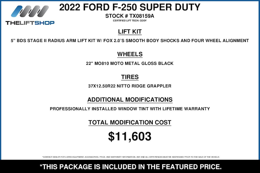 At Lifted Trucks, transparency is our priority. While we strive to provide accurate descriptions of our vehicles, please understand that errors may occur due to the human element involved in the process. All advertised vehicles are subject to actual dealer availability. Certain vehicles listed may not be available, or may have different prices. Prices exclude state tax, license, document preparation fee, smog fee, and finance charges, if applicable. Vehicle options and pricing are subject to change. Prices include all dealer rebates and dealer incentives. Pricing and availability varies by dealership. Please check with your dealer for more information. The dealer is not responsible for specific accessories or options that came with the vehicle when sold new, some of these options might pull from the vin number and be listed on our website, but what you see in the photos is what the vehicle will come with, nothing additional. Images displayed may not be representative of the actual trim level of a vehicle. Colors shown are the most accurate representations available. However, due to the limitations of web and monitor color display, we cannot guarantee that the colors depicted will exactly match the color of the car. Information provided is believed accurate but all specifications, pricing, and availability must be confirmed in writing (directly) with the dealer to be binding. Neither the Dealer nor Dealer.com is responsible for any inaccuracies contained herein and by using this application you the customer acknowledge the foregoing and accept such terms.