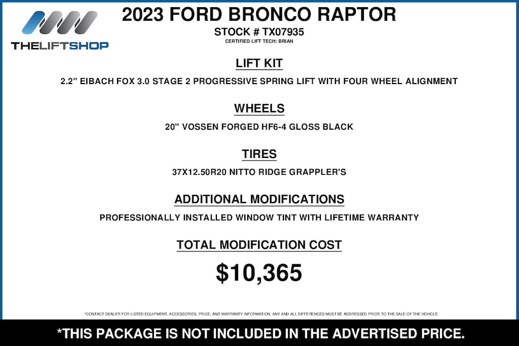 This Lifted 2023 Ford Bronco Raptor features a 2.2-inch Eibach Fox 3.0 Stage 2 Progressive Spring Lift, Four Wheel Alignment, 20-inch Vossen Forged HF6-4 Gloss Black Wheels, 37X12.50R20 Nitto Ridge Grappler Tires, and Professionally Installed Window Tint with a Lifetime Warranty. Installed by our Lift Tech, Brian. *Modifications are optional and are not included in the advertised price.*