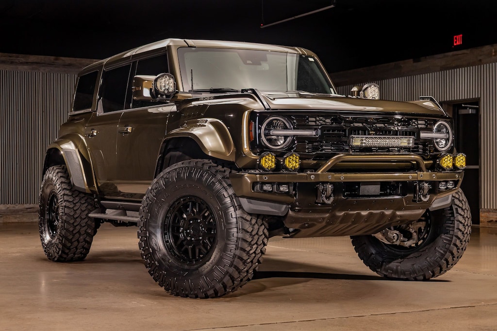 Our Lifted 2024 Ford Bronco Raptor 4 Door 4X4 helps raise the bar for remarkably rugged capability in Shelter Green with the Lux and High Packages! Motivated by a Twin-TurboCharged 3.0 Liter EcoBoost V6 providing 418hp to a 10 Speed Automatic transmission tuned for trail use. Trail Control, FOX Live Valve dampers, and electronic locking axles help you leave civilization in your rearview mirror, and this Four Wheel Drive SUV sees nearly 16mpg on the highway. Our Bronco also shows off its bold confidence with heavy-duty bash plates, rock rails, LED lighting, removable top/doors, a unique Raptor hood, bolt-on fenders, and a heavy-duty modular front bumper with RIGID off-road lighting. Our added 1.1-inch Eibach lift, custom paint to match bumpers, entire top, hood handles, hood plastics, tow hooks, and mirrors, custom smoked tail lamps and mirror lamps, custom painted emblems all around, and 17-inch Raceline Off-Road wheels with Nitto tires turn heads your way.