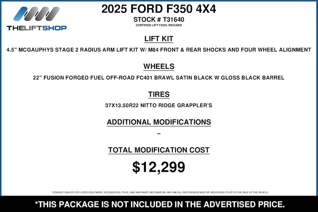 At Lifted Trucks, transparency is our priority. While we strive to provide accurate descriptions of our vehicles, please understand that errors may occur due to the human element involved in the process. All advertised vehicles are subject to actual dealer availability. Certain vehicles listed may not be available, or may have different prices. Prices exclude state tax, license, document preparation fee, smog fee, and finance charges, if applicable. Vehicle options and pricing are subject to change. Prices include all dealer rebates and dealer incentives. Pricing and availability varies by dealership. Please check with your dealer for more information. The dealer is not responsible for specific accessories or options that came with the vehicle when sold new, some of these options might pull from the vin number and be listed on our website, but what you see in the photos is what the vehicle will come with, nothing additional. Images displayed may not be representative of the actual trim level of a vehicle. Colors shown are the most accurate representations available. However, due to the limitations of web and monitor color display, we cannot guarantee that the colors depicted will exactly match the color of the car. Information provided is believed accurate but all specifications, pricing, and availability must be confirmed in writing (directly) with the dealer to be binding. Neither the Dealer nor Dealer.com is responsible for any inaccuracies contained herein and by using this application you the customer acknowledge the foregoing and accept such terms.