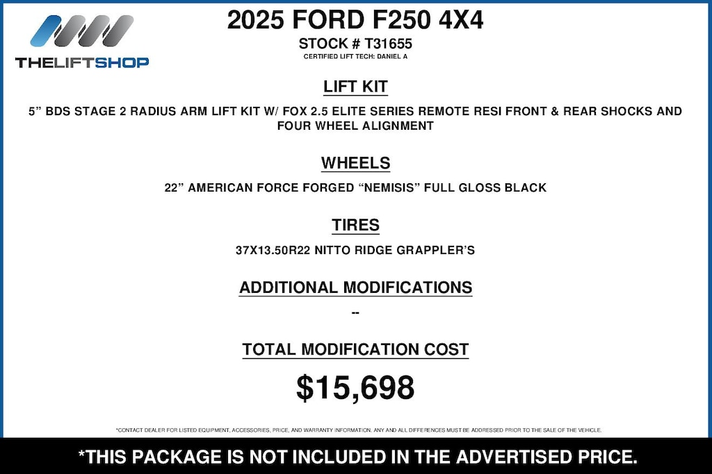At Lifted Trucks, transparency is our priority. While we strive to provide accurate descriptions of our vehicles, please understand that errors may occur due to the human element involved in the process. All advertised vehicles are subject to actual dealer availability. Certain vehicles listed may not be available, or may have different prices. Prices exclude state tax, license, document preparation fee, smog fee, and finance charges, if applicable. Vehicle options and pricing are subject to change. Prices include all dealer rebates and dealer incentives. Pricing and availability varies by dealership. Please check with your dealer for more information. The dealer is not responsible for specific accessories or options that came with the vehicle when sold new, some of these options might pull from the vin number and be listed on our website, but what you see in the photos is what the vehicle will come with, nothing additional. Images displayed may not be representative of the actual trim level of a vehicle. Colors shown are the most accurate representations available. However, due to the limitations of web and monitor color display, we cannot guarantee that the colors depicted will exactly match the color of the car. Information provided is believed accurate but all specifications, pricing, and availability must be confirmed in writing (directly) with the dealer to be binding. Neither the Dealer nor Dealer.com is responsible for any inaccuracies contained herein and by using this application you the customer acknowledge the foregoing and accept such terms.