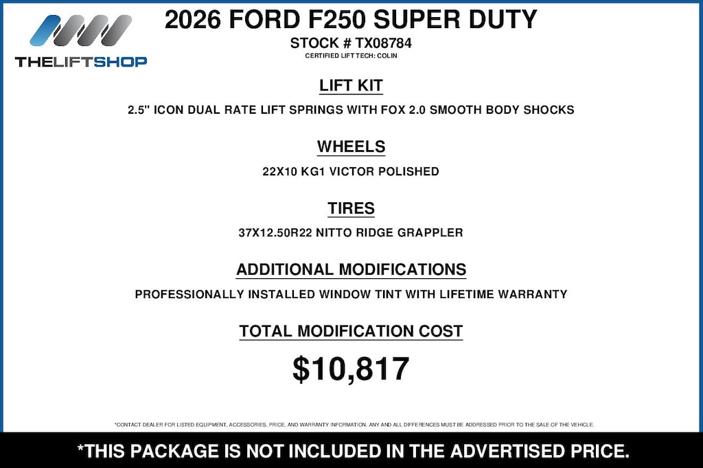 This Lifted 2026 Ford F-250 King Ranch Crew Cab 4X4 includes a 2.5-inch Icon Dual Rate Lift Springs with Fox 2.0 Smooth Body Shocks, 22X10 KG1 Victor Polished Wheels, 37X12.0R22 Nitto Ridge Grappler Tires, Professionally Installed Window Tint w/Lifetime Warranty. Installed by our Certified Lift Tech: Colin! *Modifications are optional and are not included in the advertised price.*