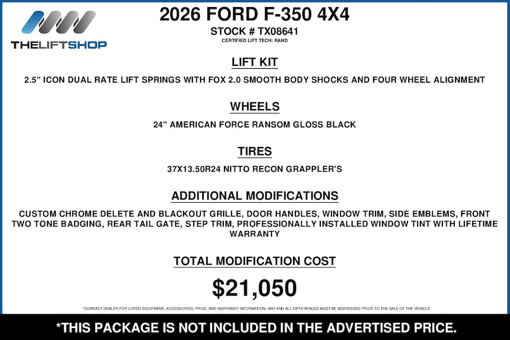 At Lifted Trucks, transparency is our priority. While we strive to provide accurate descriptions of our vehicles, please understand that errors may occur due to the human element involved in the process. All advertised vehicles are subject to actual dealer availability. Certain vehicles listed may not be available, or may have different prices. Prices exclude state tax, license, document preparation fee, smog fee, and finance charges, if applicable. Vehicle options and pricing are subject to change. Prices include all dealer rebates and dealer incentives. Pricing and availability varies by dealership. Please check with your dealer for more information. The dealer is not responsible for specific accessories or options that came with the vehicle when sold new, some of these options might pull from the vin number and be listed on our website, but what you see in the photos is what the vehicle will come with, nothing additional. Images displayed may not be representative of the actual trim level of a vehicle. Colors shown are the most accurate representations available. However, due to the limitations of web and monitor color display, we cannot guarantee that the colors depicted will exactly match the color of the car. Information provided is believed accurate but all specifications, pricing, and availability must be confirmed in writing (directly) with the dealer to be binding. Neither the Dealer nor Dealer.com is responsible for any inaccuracies contained herein and by using this application you the customer acknowledge the foregoing and accept such terms.