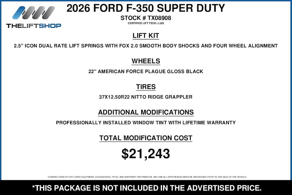 At Lifted Trucks, transparency is our priority. While we strive to provide accurate descriptions of our vehicles, please understand that errors may occur due to the human element involved in the process. All advertised vehicles are subject to actual dealer availability. Certain vehicles listed may not be available, or may have different prices. Prices exclude state tax, license, document preparation fee, smog fee, and finance charges, if applicable. Vehicle options and pricing are subject to change. Prices include all dealer rebates and dealer incentives. Pricing and availability varies by dealership. Please check with your dealer for more information. The dealer is not responsible for specific accessories or options that came with the vehicle when sold new, some of these options might pull from the vin number and be listed on our website, but what you see in the photos is what the vehicle will come with, nothing additional. Images displayed may not be representative of the actual trim level of a vehicle. Colors shown are the most accurate representations available. However, due to the limitations of web and monitor color display, we cannot guarantee that the colors depicted will exactly match the color of the car. Information provided is believed accurate but all specifications, pricing, and availability must be confirmed in writing (directly) with the dealer to be binding. Neither the Dealer nor Dealer.com is responsible for any inaccuracies contained herein and by using this application you the customer acknowledge the foregoing and accept such terms.