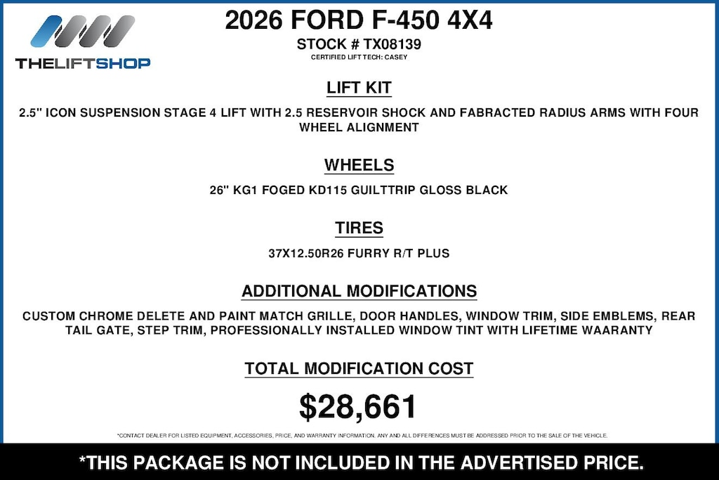 This Lifted 2026 Ford F-450 Platinum Crew Cab 4X4 Dually includes a 2.5-inch Icon Suspension Stage 4 Lift with 2.5 Reservoir Shock and Fabricated Radius Arms with Four Wheel Alignment, 26-inch KG1 Forged KD115 GuiltTrip Gloss Black Wheels, 37X12.50R26 Furry R/T Plus Tires, Custom Chrome Delete and Paint Match Grille, Door Handles, Window Trim, Side Emblems, Rear Tailgate, Step Trim, Professionally Installed Window Tint w/Lifetime Warranty. Installed by our Certified Lift Tech: Casey! *Modifications are optional and are not included in the advertised price.*