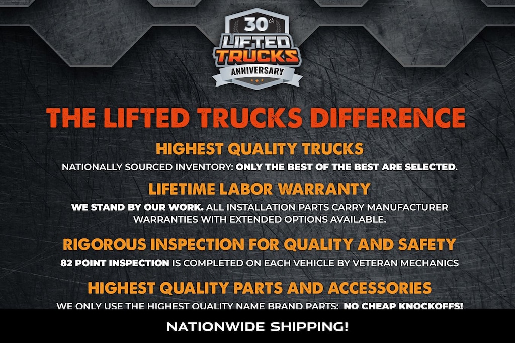 At Lifted Trucks, transparency is our priority. While we strive to provide accurate descriptions of our vehicles, please understand that errors may occur due to the human element involved in the process. All advertised vehicles are subject to actual dealer availability. Certain vehicles listed may not be available, or may have different prices. Prices exclude state tax, license, document preparation fee, smog fee, and finance charges, if applicable. Vehicle options and pricing are subject to change. Prices include all dealer rebates and dealer incentives. Pricing and availability varies by dealership. Please check with your dealer for more information. The dealer is not responsible for specific accessories or options that came with the vehicle when sold new, some of these options might pull from the vin number and be listed on our website, but what you see in the photos is what the vehicle will come with, nothing additional. Images displayed may not be representative of the actual trim level of a vehicle. Colors shown are the most accurate representations available. However, due to the limitations of web and monitor color display, we cannot guarantee that the colors depicted will exactly match the color of the car. Information provided is believed accurate but all specifications, pricing, and availability must be confirmed in writing (directly) with the dealer to be binding. Neither the Dealer nor Dealer.com is responsible for any inaccuracies contained herein and by using this application you the customer acknowledge the foregoing and accept such terms.