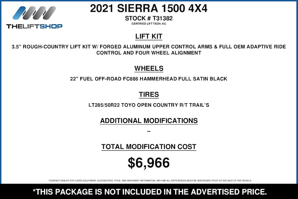 At Lifted Trucks, transparency is our priority. While we strive to provide accurate descriptions of our vehicles, please understand that errors may occur due to the human element involved in the process. All advertised vehicles are subject to actual dealer availability. Certain vehicles listed may not be available, or may have different prices. Prices exclude state tax, license, document preparation fee, smog fee, and finance charges, if applicable. Vehicle options and pricing are subject to change. Prices include all dealer rebates and dealer incentives. Pricing and availability varies by dealership. Please check with your dealer for more information. The dealer is not responsible for specific accessories or options that came with the vehicle when sold new, some of these options might pull from the vin number and be listed on our website, but what you see in the photos is what the vehicle will come with, nothing additional. Images displayed may not be representative of the actual trim level of a vehicle. Colors shown are the most accurate representations available. However, due to the limitations of web and monitor color display, we cannot guarantee that the colors depicted will exactly match the color of the car. Information provided is believed accurate but all specifications, pricing, and availability must be confirmed in writing (directly) with the dealer to be binding. Neither the Dealer nor Dealer.com is responsible for any inaccuracies contained herein and by using this application you the customer acknowledge the foregoing and accept such terms.