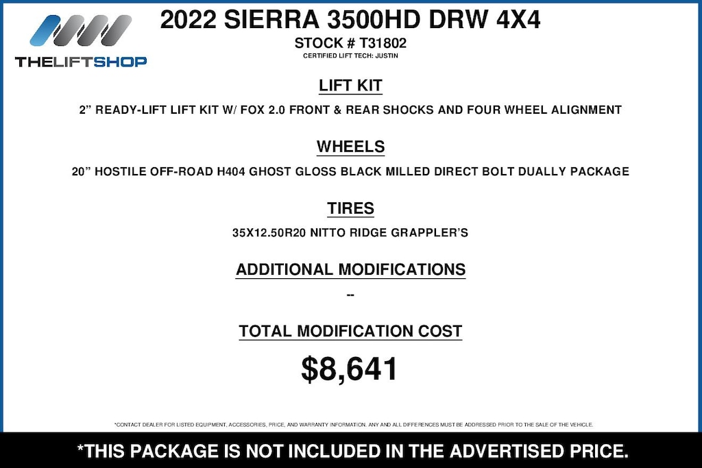 At Lifted Trucks, transparency is our priority. While we strive to provide accurate descriptions of our vehicles, please understand that errors may occur due to the human element involved in the process. All advertised vehicles are subject to actual dealer availability. Certain vehicles listed may not be available, or may have different prices. Prices exclude state tax, license, document preparation fee, smog fee, and finance charges, if applicable. Vehicle options and pricing are subject to change. Prices include all dealer rebates and dealer incentives. Pricing and availability varies by dealership. Please check with your dealer for more information. The dealer is not responsible for specific accessories or options that came with the vehicle when sold new, some of these options might pull from the vin number and be listed on our website, but what you see in the photos is what the vehicle will come with, nothing additional. Images displayed may not be representative of the actual trim level of a vehicle. Colors shown are the most accurate representations available. However, due to the limitations of web and monitor color display, we cannot guarantee that the colors depicted will exactly match the color of the car. Information provided is believed accurate but all specifications, pricing, and availability must be confirmed in writing (directly) with the dealer to be binding. Neither the Dealer nor Dealer.com is responsible for any inaccuracies contained herein and by using this application you the customer acknowledge the foregoing and accept such terms.