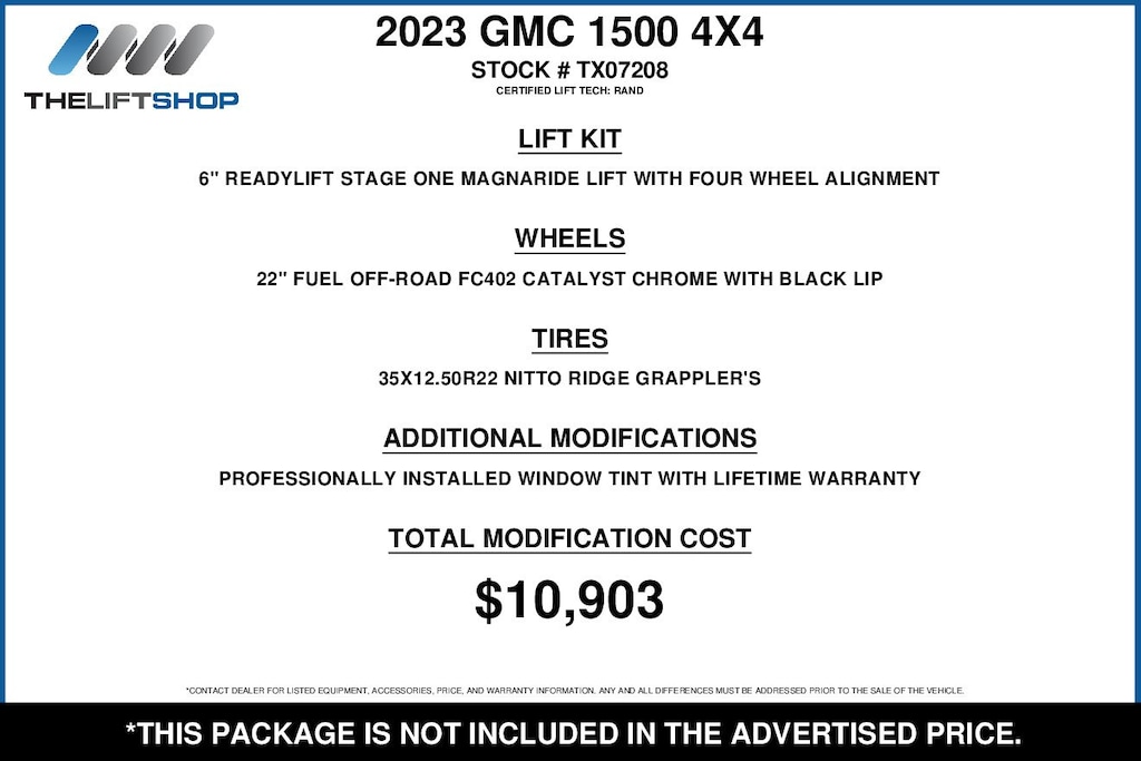 At Lifted Trucks, transparency is our priority. While we strive to provide accurate descriptions of our vehicles, please understand that errors may occur due to the human element involved in the process. All advertised vehicles are subject to actual dealer availability. Certain vehicles listed may not be available, or may have different prices. Prices exclude state tax, license, document preparation fee, smog fee, and finance charges, if applicable. Vehicle options and pricing are subject to change. Prices include all dealer rebates and dealer incentives. Pricing and availability varies by dealership. Please check with your dealer for more information. The dealer is not responsible for specific accessories or options that came with the vehicle when sold new, some of these options might pull from the vin number and be listed on our website, but what you see in the photos is what the vehicle will come with, nothing additional. Images displayed may not be representative of the actual trim level of a vehicle. Colors shown are the most accurate representations available. However, due to the limitations of web and monitor color display, we cannot guarantee that the colors depicted will exactly match the color of the car. Information provided is believed accurate but all specifications, pricing, and availability must be confirmed in writing (directly) with the dealer to be binding. Neither the Dealer nor Dealer.com is responsible for any inaccuracies contained herein and by using this application you the customer acknowledge the foregoing and accept such terms.