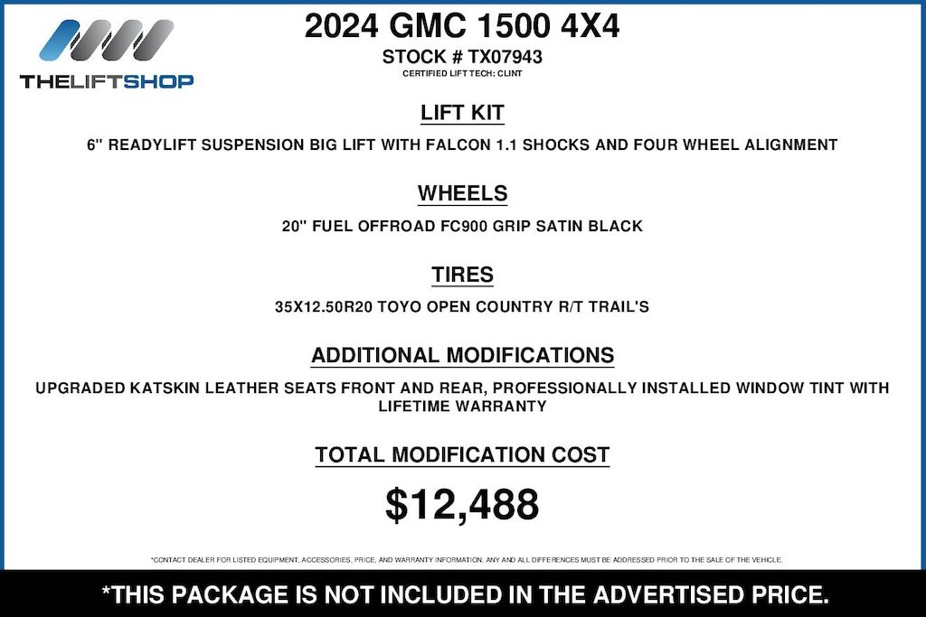 This Lifted 2024 GMC Sierra 1500 Elevation Crew Cab 4X4 includes a 6-inch ReadyLift Big Lift w/Falcon 1.1 Shocks and Four Wheel Alignment, 20-inch Fuel Off-Road FC900 Grip Satin Black Wheels, 35X12.50R20 Toyo Open Country R/T Trail Tires. Installed by our Certified Lift Tech: Clint! *Modifications are optional and are not included in the advertised price.*