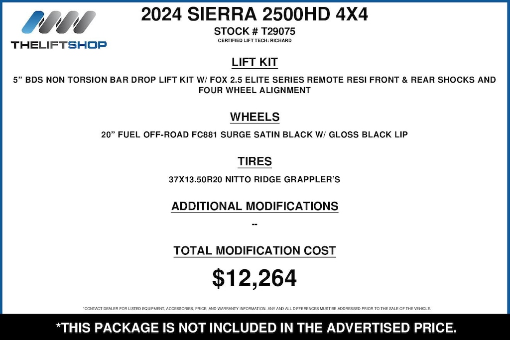 This Lifted 2024 GMC Sierra 2500HD includes a 5-inch BDS Lift with Fox 2.5 Shocks and 20-inch Fuel Wheels with Nitto Ridge Grappler Tires Installed by our Lift Tech Richard! *Modifications are optional and are not included in the advertised price.*