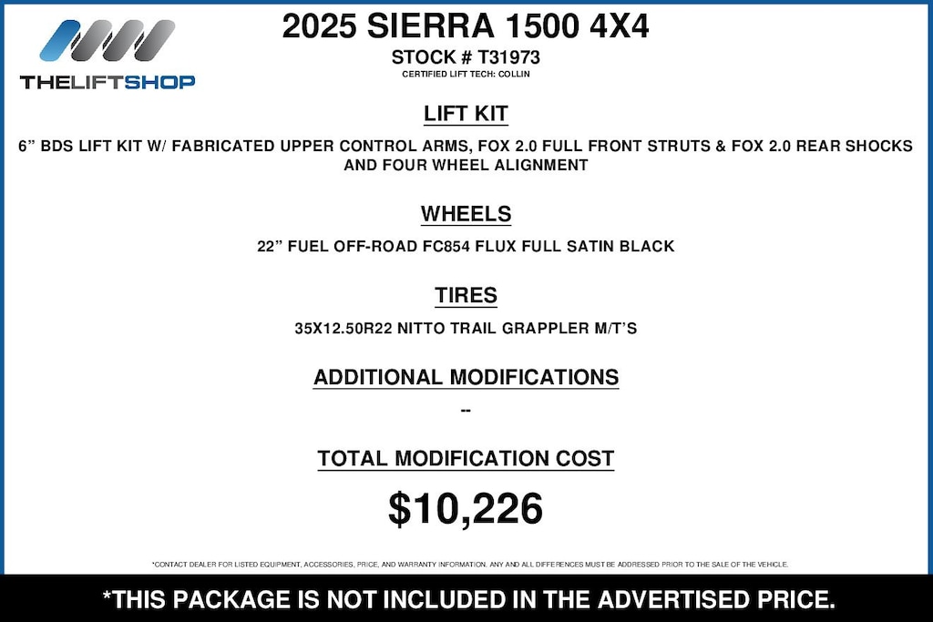 At Lifted Trucks, transparency is our priority. While we strive to provide accurate descriptions of our vehicles, please understand that errors may occur due to the human element involved in the process. All advertised vehicles are subject to actual dealer availability. Certain vehicles listed may not be available, or may have different prices. Prices exclude state tax, license, document preparation fee, smog fee, and finance charges, if applicable. Vehicle options and pricing are subject to change. Prices include all dealer rebates and dealer incentives. Pricing and availability varies by dealership. Please check with your dealer for more information. The dealer is not responsible for specific accessories or options that came with the vehicle when sold new, some of these options might pull from the vin number and be listed on our website, but what you see in the photos is what the vehicle will come with, nothing additional. Images displayed may not be representative of the actual trim level of a vehicle. Colors shown are the most accurate representations available. However, due to the limitations of web and monitor color display, we cannot guarantee that the colors depicted will exactly match the color of the car. Information provided is believed accurate but all specifications, pricing, and availability must be confirmed in writing (directly) with the dealer to be binding. Neither the Dealer nor Dealer.com is responsible for any inaccuracies contained herein and by using this application you the customer acknowledge the foregoing and accept such terms.