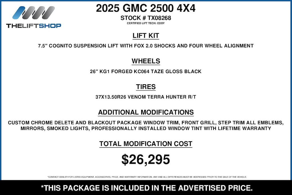At Lifted Trucks, transparency is our priority. While we strive to provide accurate descriptions of our vehicles, please understand that errors may occur due to the human element involved in the process. All advertised vehicles are subject to actual dealer availability. Certain vehicles listed may not be available, or may have different prices. Prices exclude state tax, license, document preparation fee, smog fee, and finance charges, if applicable. Vehicle options and pricing are subject to change. Prices include all dealer rebates and dealer incentives. Pricing and availability varies by dealership. Please check with your dealer for more information. The dealer is not responsible for specific accessories or options that came with the vehicle when sold new, some of these options might pull from the vin number and be listed on our website, but what you see in the photos is what the vehicle will come with, nothing additional. Images displayed may not be representative of the actual trim level of a vehicle. Colors shown are the most accurate representations available. However, due to the limitations of web and monitor color display, we cannot guarantee that the colors depicted will exactly match the color of the car. Information provided is believed accurate but all specifications, pricing, and availability must be confirmed in writing (directly) with the dealer to be binding. Neither the Dealer nor Dealer.com is responsible for any inaccuracies contained herein and by using this application you the customer acknowledge the foregoing and accept such terms.