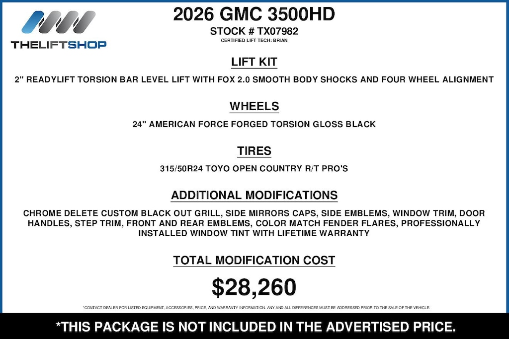 This Leveled 2026 GMC Sierra 3500HD Denali Ultimate Crew Cab 4X4 includes a 2-inch ReadyLift Torsion Bar Level Lift with Fox 2.0 Smooth Body Shocks and Four Wheel Alignment, 24-inch American Force Forged Torsion Gloss Black Wheels, 315/50R24 Toyo Open Country R/T Pro Tires, Chrome Delete Custom Black Out Grille, Side Mirror Caps, Side Emblems, Window Trim, Door Handles, Step Trim, Front & Rear Emblems, Color Match Fender Flares, Professionally Installed Window Tint w/Lifetime Warranty. Installed by our Certified Lift Tech: Brian! *Modifications are optional and are not included in the advertised price.*