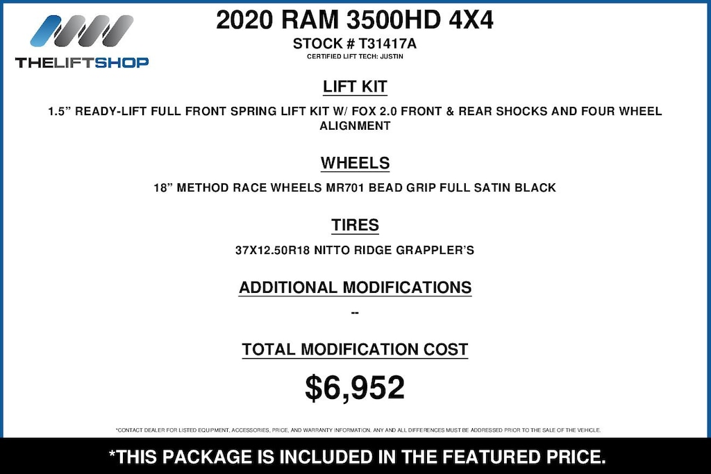 At Lifted Trucks, transparency is our priority. While we strive to provide accurate descriptions of our vehicles, please understand that errors may occur due to the human element involved in the process. All advertised vehicles are subject to actual dealer availability. Certain vehicles listed may not be available, or may have different prices. Prices exclude state tax, license, document preparation fee, smog fee, and finance charges, if applicable. Vehicle options and pricing are subject to change. Prices include all dealer rebates and dealer incentives. Pricing and availability varies by dealership. Please check with your dealer for more information. The dealer is not responsible for specific accessories or options that came with the vehicle when sold new, some of these options might pull from the vin number and be listed on our website, but what you see in the photos is what the vehicle will come with, nothing additional. Images displayed may not be representative of the actual trim level of a vehicle. Colors shown are the most accurate representations available. However, due to the limitations of web and monitor color display, we cannot guarantee that the colors depicted will exactly match the color of the car. Information provided is believed accurate but all specifications, pricing, and availability must be confirmed in writing (directly) with the dealer to be binding. Neither the Dealer nor Dealer.com is responsible for any inaccuracies contained herein and by using this application you the customer acknowledge the foregoing and accept such terms.