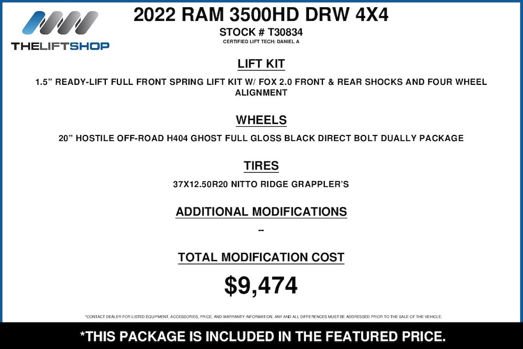 This Lifted 2022 Ram 3500 Laramie features a 1.5-inch ReadyLift Full Front Spring Lift Kit, Fox 2.0 Front & Rear Shocks, Four Wheel Alignment, 20-inch Hostile Off-Road H404 Ghost Full Gloss Black Wheels, and 37X12.50R20 Nitto Ridge Grappler Tires. Installed by our Lift Tech, Daniel A. *Modifications are included in the featured price.*