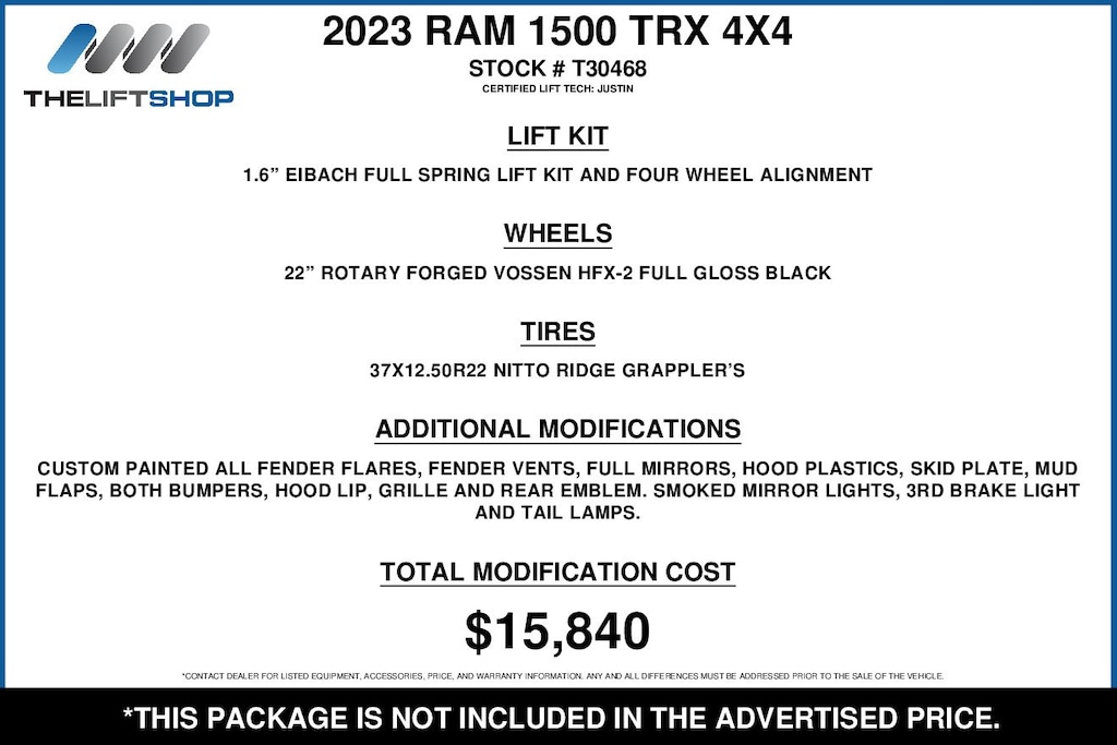 At Lifted Trucks, transparency is our priority. While we strive to provide accurate descriptions of our vehicles, please understand that errors may occur due to the human element involved in the process. All advertised vehicles are subject to actual dealer availability. Certain vehicles listed may not be available, or may have different prices. Prices exclude state tax, license, document preparation fee, smog fee, and finance charges, if applicable. Vehicle options and pricing are subject to change. Prices include all dealer rebates and dealer incentives. Pricing and availability varies by dealership. Please check with your dealer for more information. The dealer is not responsible for specific accessories or options that came with the vehicle when sold new, some of these options might pull from the vin number and be listed on our website, but what you see in the photos is what the vehicle will come with, nothing additional. Images displayed may not be representative of the actual trim level of a vehicle. Colors shown are the most accurate representations available. However, due to the limitations of web and monitor color display, we cannot guarantee that the colors depicted will exactly match the color of the car. Information provided is believed accurate but all specifications, pricing, and availability must be confirmed in writing (directly) with the dealer to be binding. Neither the Dealer nor Dealer.com is responsible for any inaccuracies contained herein and by using this application you the customer acknowledge the foregoing and accept such terms.