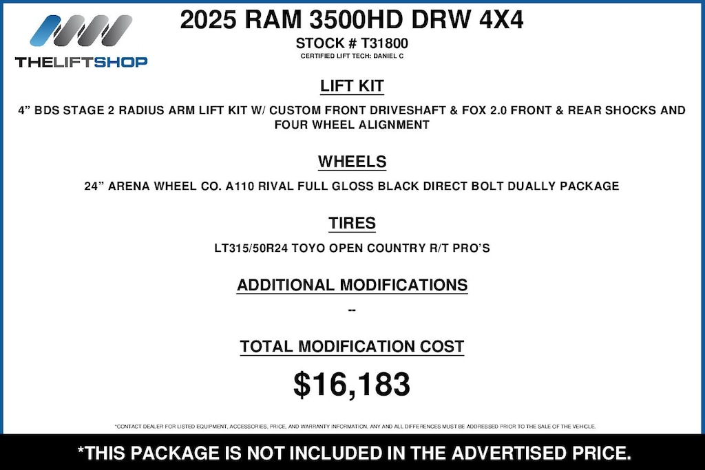 This Lifted 2025 Ram 3500 Laramie features a 4-inch BDS Stage 2 Arm Lift Kit with Custom Front Driveshaft, Fox 2.0 Front & Rear Shocks, Four Wheel Alignment, 24-inch Arena A110 Rival Full Gloss Black Wheels, and LT 315/50R24 Toyo Open Country R/T Pro Tires. Installed by our Lift Tech, Daniel C. *Modifications are optional and are not included in the advertised price.*