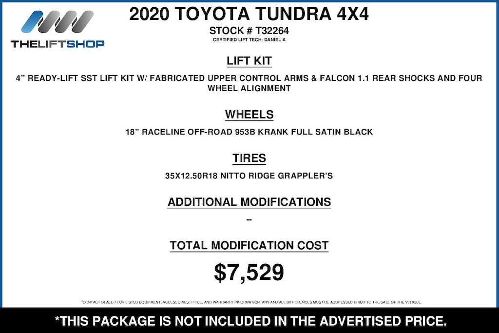 At Lifted Trucks, transparency is our priority. While we strive to provide accurate descriptions of our vehicles, please understand that errors may occur due to the human element involved in the process. All advertised vehicles are subject to actual dealer availability. Certain vehicles listed may not be available, or may have different prices. Prices exclude state tax, license, document preparation fee, smog fee, and finance charges, if applicable. Vehicle options and pricing are subject to change. Prices include all dealer rebates and dealer incentives. Pricing and availability varies by dealership. Please check with your dealer for more information. The dealer is not responsible for specific accessories or options that came with the vehicle when sold new, some of these options might pull from the vin number and be listed on our website, but what you see in the photos is what the vehicle will come with, nothing additional. Images displayed may not be representative of the actual trim level of a vehicle. Colors shown are the most accurate representations available. However, due to the limitations of web and monitor color display, we cannot guarantee that the colors depicted will exactly match the color of the car. Information provided is believed accurate but all specifications, pricing, and availability must be confirmed in writing (directly) with the dealer to be binding. Neither the Dealer nor Dealer.com is responsible for any inaccuracies contained herein and by using this application you the customer acknowledge the foregoing and accept such terms.