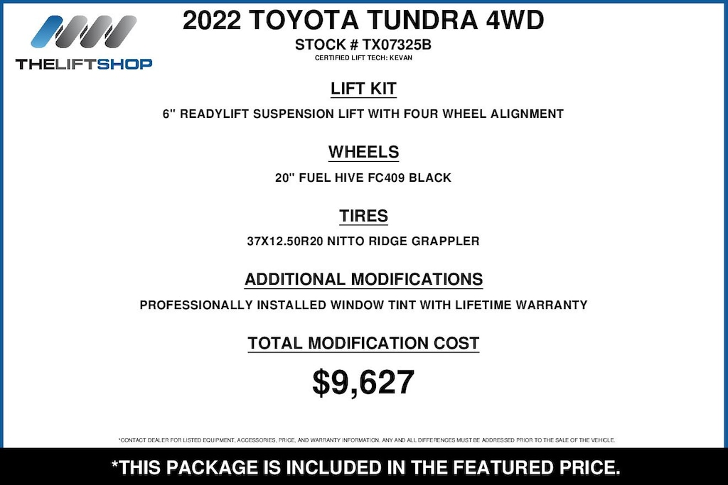 The Lifted Trucks' difference is to provide vehicles that have been enhanced to maintain the highest quality. This may include pre installed products including but not limited to hospital-grade sanitation applications, paint and fabric protection, and theft deterrent solutions. All pre-installed products and their extended benefit plans should be considered optional.