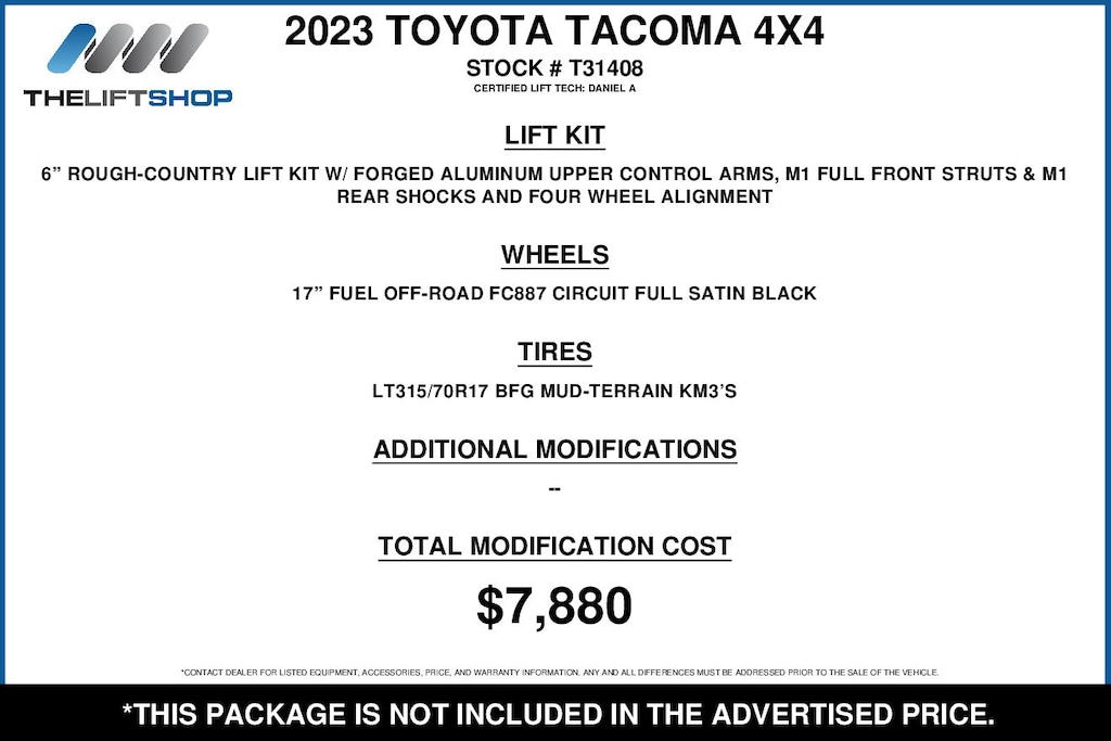 At Lifted Trucks, transparency is our priority. While we strive to provide accurate descriptions of our vehicles, please understand that errors may occur due to the human element involved in the process. All advertised vehicles are subject to actual dealer availability. Certain vehicles listed may not be available, or may have different prices. Prices exclude state tax, license, document preparation fee, smog fee, and finance charges, if applicable. Vehicle options and pricing are subject to change. Prices include all dealer rebates and dealer incentives. Pricing and availability varies by dealership. Please check with your dealer for more information. The dealer is not responsible for specific accessories or options that came with the vehicle when sold new, some of these options might pull from the vin number and be listed on our website, but what you see in the photos is what the vehicle will come with, nothing additional. Images displayed may not be representative of the actual trim level of a vehicle. Colors shown are the most accurate representations available. However, due to the limitations of web and monitor color display, we cannot guarantee that the colors depicted will exactly match the color of the car. Information provided is believed accurate but all specifications, pricing, and availability must be confirmed in writing (directly) with the dealer to be binding. Neither the Dealer nor Dealer.com is responsible for any inaccuracies contained herein and by using this application you the customer acknowledge the foregoing and accept such terms.