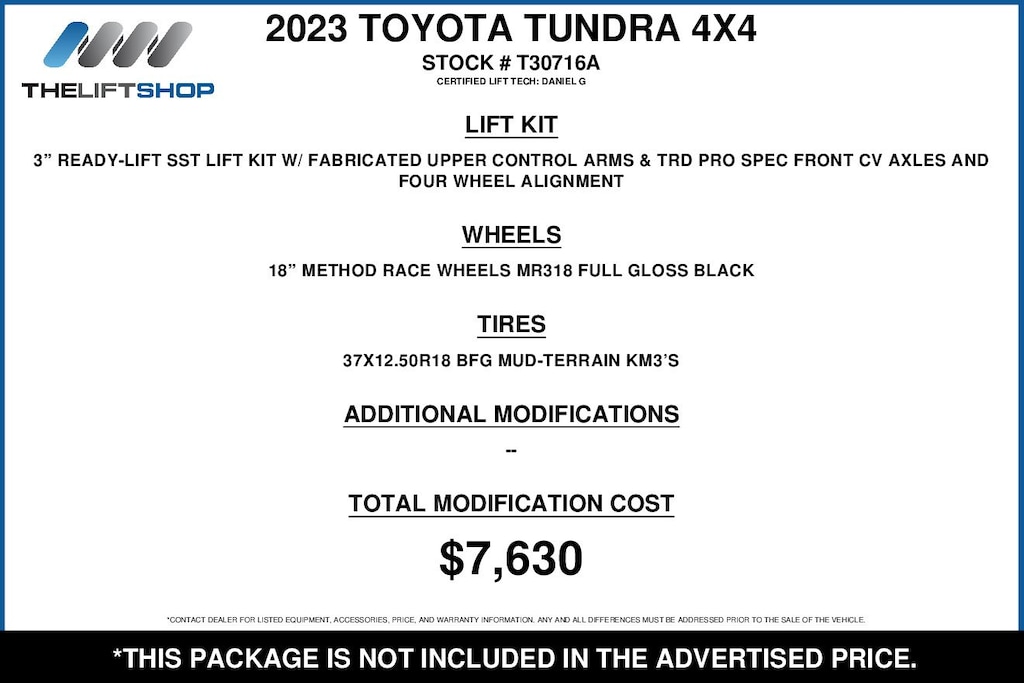 At Lifted Trucks, transparency is our priority. While we strive to provide accurate descriptions of our vehicles, please understand that errors may occur due to the human element involved in the process. All advertised vehicles are subject to actual dealer availability. Certain vehicles listed may not be available, or may have different prices. Prices exclude state tax, license, document preparation fee, smog fee, and finance charges, if applicable. Vehicle options and pricing are subject to change. Prices include all dealer rebates and dealer incentives. Pricing and availability varies by dealership. Please check with your dealer for more information. The dealer is not responsible for specific accessories or options that came with the vehicle when sold new, some of these options might pull from the vin number and be listed on our website, but what you see in the photos is what the vehicle will come with, nothing additional. Images displayed may not be representative of the actual trim level of a vehicle. Colors shown are the most accurate representations available. However, due to the limitations of web and monitor color display, we cannot guarantee that the colors depicted will exactly match the color of the car. Information provided is believed accurate but all specifications, pricing, and availability must be confirmed in writing (directly) with the dealer to be binding. Neither the Dealer nor Dealer.com is responsible for any inaccuracies contained herein and by using this application you the customer acknowledge the foregoing and accept such terms.