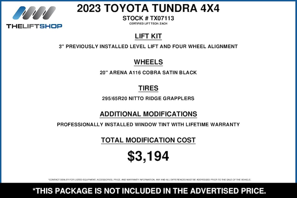 The Lifted Trucks' difference is to provide vehicles that have been enhanced to maintain the highest quality. This may include pre installed products including but not limited to hospital-grade sanitation applications, paint and fabric protection, and theft deterrent solutions. All pre-installed products and their extended benefit plans should be considered optional.