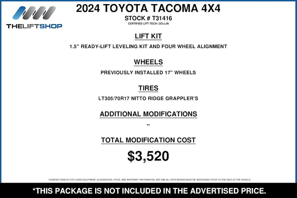 At Lifted Trucks, transparency is our priority. While we strive to provide accurate descriptions of our vehicles, please understand that errors may occur due to the human element involved in the process. All advertised vehicles are subject to actual dealer availability. Certain vehicles listed may not be available, or may have different prices. Prices exclude state tax, license, document preparation fee, smog fee, and finance charges, if applicable. Vehicle options and pricing are subject to change. Prices include all dealer rebates and dealer incentives. Pricing and availability varies by dealership. Please check with your dealer for more information. The dealer is not responsible for specific accessories or options that came with the vehicle when sold new, some of these options might pull from the vin number and be listed on our website, but what you see in the photos is what the vehicle will come with, nothing additional. Images displayed may not be representative of the actual trim level of a vehicle. Colors shown are the most accurate representations available. However, due to the limitations of web and monitor color display, we cannot guarantee that the colors depicted will exactly match the color of the car. Information provided is believed accurate but all specifications, pricing, and availability must be confirmed in writing (directly) with the dealer to be binding. Neither the Dealer nor Dealer.com is responsible for any inaccuracies contained herein and by using this application you the customer acknowledge the foregoing and accept such terms.