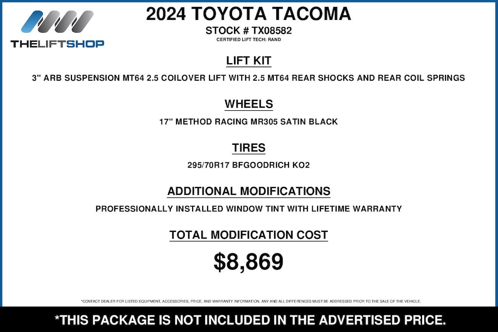 At Lifted Trucks, transparency is our priority. While we strive to provide accurate descriptions of our vehicles, please understand that errors may occur due to the human element involved in the process. All advertised vehicles are subject to actual dealer availability. Certain vehicles listed may not be available, or may have different prices. Prices exclude state tax, license, document preparation fee, smog fee, and finance charges, if applicable. Vehicle options and pricing are subject to change. Prices include all dealer rebates and dealer incentives. Pricing and availability varies by dealership. Please check with your dealer for more information. The dealer is not responsible for specific accessories or options that came with the vehicle when sold new, some of these options might pull from the vin number and be listed on our website, but what you see in the photos is what the vehicle will come with, nothing additional. Images displayed may not be representative of the actual trim level of a vehicle. Colors shown are the most accurate representations available. However, due to the limitations of web and monitor color display, we cannot guarantee that the colors depicted will exactly match the color of the car. Information provided is believed accurate but all specifications, pricing, and availability must be confirmed in writing (directly) with the dealer to be binding. Neither the Dealer nor Dealer.com is responsible for any inaccuracies contained herein and by using this application you the customer acknowledge the foregoing and accept such terms.