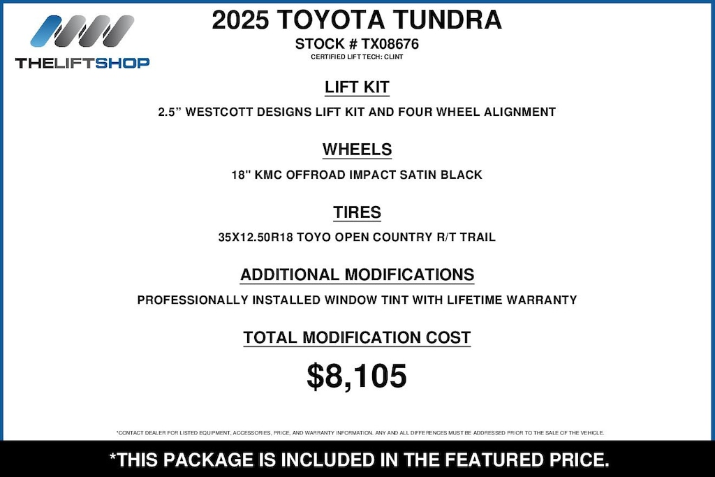 The Lifted Trucks' difference is to provide vehicles that have been enhanced to maintain the highest quality. This may include pre installed products including but not limited to hospital-grade sanitation applications, paint and fabric protection, and theft deterrent solutions. All pre-installed products and their extended benefit plans should be considered optional.
