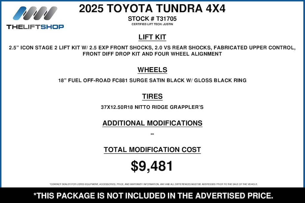 At Lifted Trucks, transparency is our priority. While we strive to provide accurate descriptions of our vehicles, please understand that errors may occur due to the human element involved in the process. All advertised vehicles are subject to actual dealer availability. Certain vehicles listed may not be available, or may have different prices. Prices exclude state tax, license, document preparation fee, smog fee, and finance charges, if applicable. Vehicle options and pricing are subject to change. Prices include all dealer rebates and dealer incentives. Pricing and availability varies by dealership. Please check with your dealer for more information. The dealer is not responsible for specific accessories or options that came with the vehicle when sold new, some of these options might pull from the vin number and be listed on our website, but what you see in the photos is what the vehicle will come with, nothing additional. Images displayed may not be representative of the actual trim level of a vehicle. Colors shown are the most accurate representations available. However, due to the limitations of web and monitor color display, we cannot guarantee that the colors depicted will exactly match the color of the car. Information provided is believed accurate but all specifications, pricing, and availability must be confirmed in writing (directly) with the dealer to be binding. Neither the Dealer nor Dealer.com is responsible for any inaccuracies contained herein and by using this application you the customer acknowledge the foregoing and accept such terms.