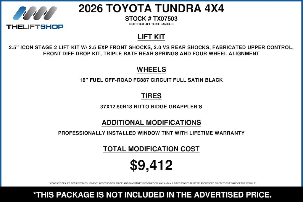 At Lifted Trucks, transparency is our priority. While we strive to provide accurate descriptions of our vehicles, please understand that errors may occur due to the human element involved in the process. All advertised vehicles are subject to actual dealer availability. Certain vehicles listed may not be available, or may have different prices. Prices exclude state tax, license, document preparation fee, smog fee, and finance charges, if applicable. Vehicle options and pricing are subject to change. Prices include all dealer rebates and dealer incentives. Pricing and availability varies by dealership. Please check with your dealer for more information. The dealer is not responsible for specific accessories or options that came with the vehicle when sold new, some of these options might pull from the vin number and be listed on our website, but what you see in the photos is what the vehicle will come with, nothing additional. Images displayed may not be representative of the actual trim level of a vehicle. Colors shown are the most accurate representations available. However, due to the limitations of web and monitor color display, we cannot guarantee that the colors depicted will exactly match the color of the car. Information provided is believed accurate but all specifications, pricing, and availability must be confirmed in writing (directly) with the dealer to be binding. Neither the Dealer nor Dealer.com is responsible for any inaccuracies contained herein and by using this application you the customer acknowledge the foregoing and accept such terms.