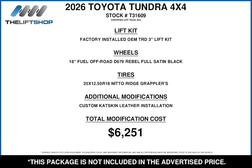 This Lifted 2026 Toyota Tundra SR5 CrewMax 4X4 includes a Factory-Installed OEM TRD 3-inch Lift Kit, 18-inch Fuel Off-Road D679 Rebel Full Satin Black Wheels, 35X12.50R18 Nitto Ridge Grappler Tires, Custom Katskin Leather Installation. Installed by our Certified Lift Tech: N/A! *Modifications are optional and are not included in the advertised price.*