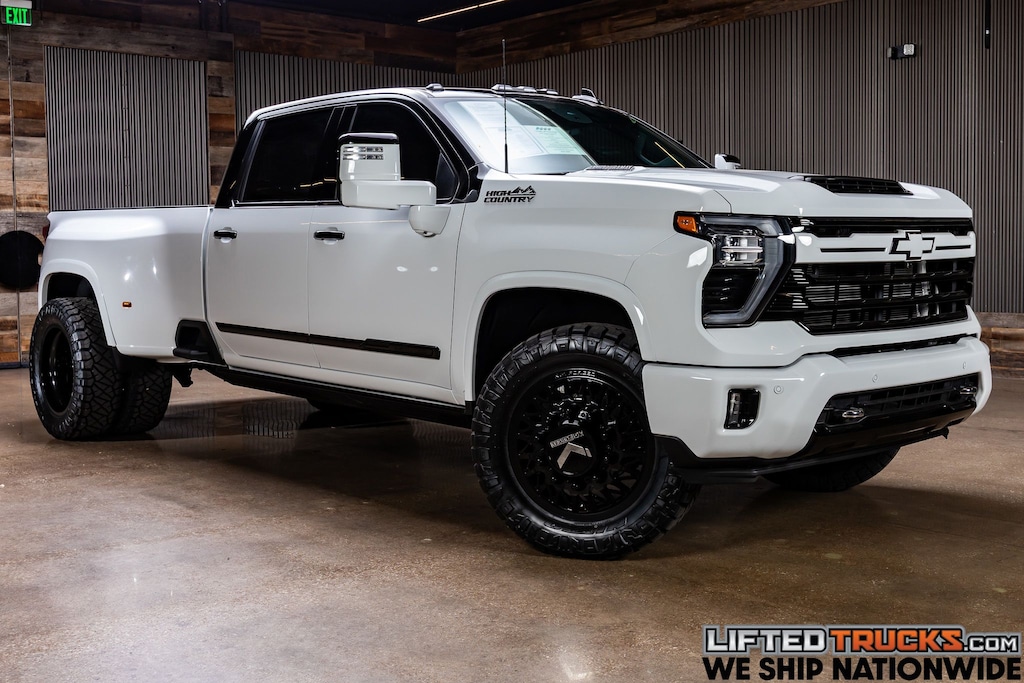 Our One Owner, Diesel powered 2024 Chevrolet Silverado 3500 High Country Crew Cab Long Box Dually 4X4 with the Tech Pack is a tough truck that's here to take charge of your world in Summit White w/Black Tuxedo Top! Motivated by a TurboCharged 6.6 Liter DuraMax Diesel V8 serving up 470hp and 975lb-ft of torque to a 10 Speed Allison Automatic transmission for muscular performance, especially when pulling. This Four Wheel Drive truck also inspires confidence with Digital Variable Steering and a bold design. Our Silverado is a stunner with LED lighting, fog lamps, a 2-inch Torsion Bar Level Lift with Fox 2.0 Smooth Body Shocks and Four Wheel Alignment, 22-inch KG1 Forged KD054 Glaze Gloss Black Wheels, 37X12.50R22 Nitto Ridge Grappler Tires, Custom Chrome Delete Paint Matched Flares & Emblems w/Black Out Grille Side Trim, Step Trim and Window Trim, Professionally Installed Window Tint w/Lifetime Warranty, power-retractable assist steps, a Multi-Flex tailgate, a spray-on bedliner, cargo-bed lighting, power trailering mirrors, and a power tailgate.