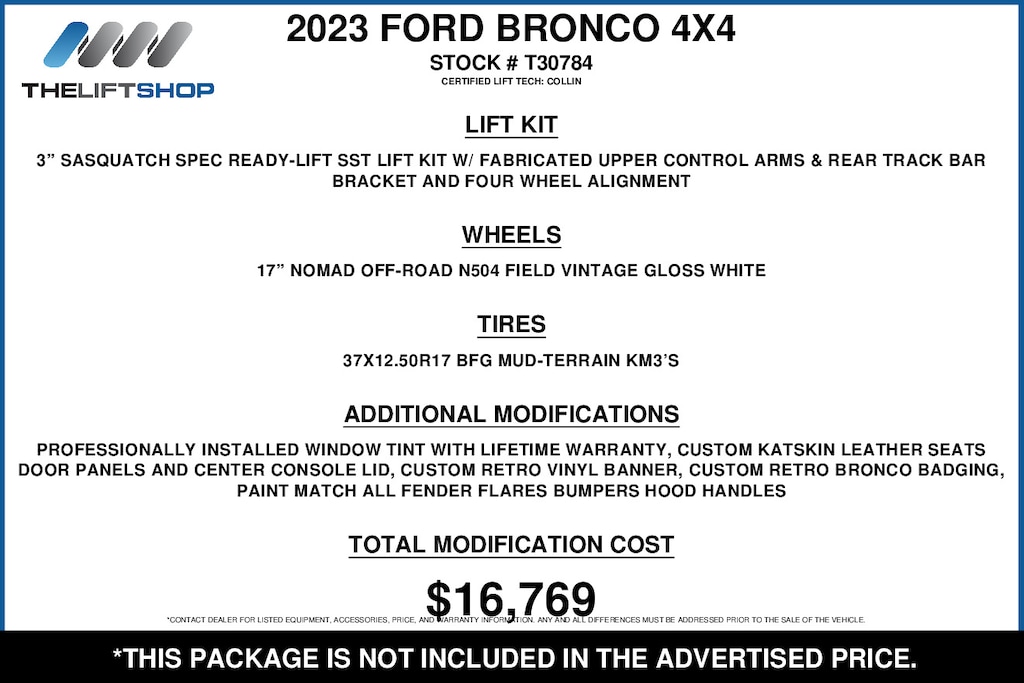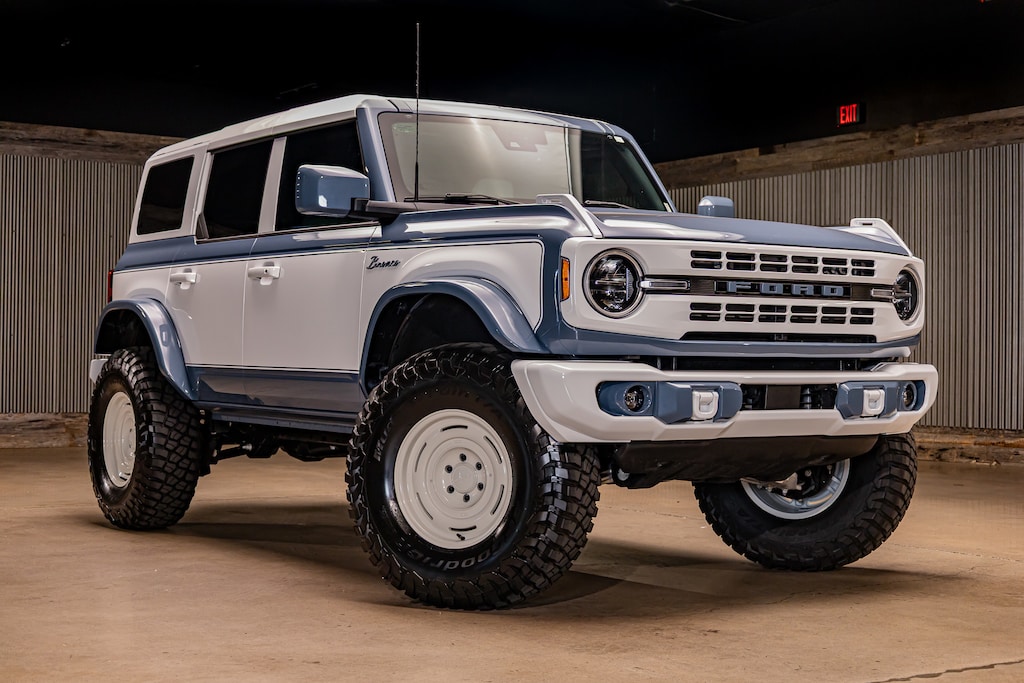This Lifted 2023 Ford Bronco Heritage Edition features 3-inch Sasquatch Spec ReadyLift with Fabricated Upper Control Arms and Rear Track Bar Bracket, Four Wheel Alignment, 17-inch Nomad Off-Road N504 Field Vintage Gloss White Wheels, 37X12.50R17 BFG Mud-Terrain KM3 Tires, Custom Katskin Leather, Paint Match, and Professionally Installed Window Tint with a Lifetime Warranty, Installed by our Certified Lift Tech, Collin. *Modifications are optional and are not included in the advertised price.*