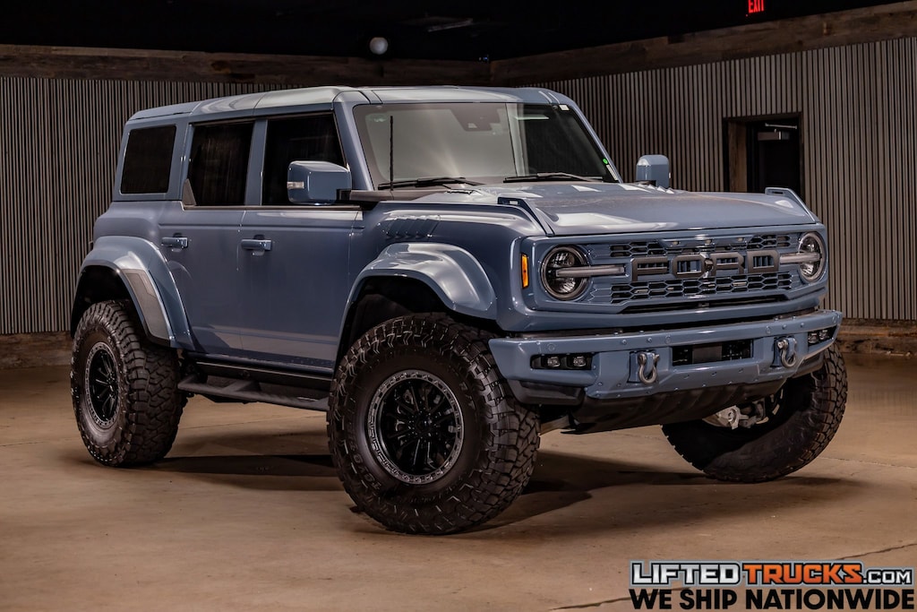 Our 2023 Ford Bronco Raptor 4 Door 4X4 has an incredible appetite for action in Azure Gray Metallic Tri-Coat with the Lux and High Packages! Motivated by a Twin-TurboCharged 3.0 Liter EcoBoost V6 supplying 400hp to a 10 Speed Automatic transmission for high-performance acceleration. This Four Wheel Drive SUV is also as capable as it is quick, thanks to locking axles and Trail Control, and it sees nearly 16mpg on the highway. Aggressive styling enhances our Bronco with an exclusive Raptor hood, bolt-on fenders, rock rails with removable running boards, a heavy-duty modular front bumper with Rigid fog lamps, steel bash plates, and a fully removable top/doors. The added lift kit, custom paint to match body color entire roof, door handles, fender flares, hood handles, and both bumpers, custom painted grille lettering and emblems, and custom black 17-inch TIS Off-Road wheels with custom tires enhance the look.