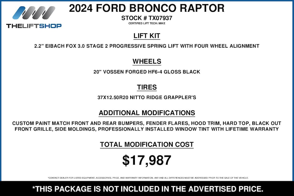 This Lifted 2024 Ford Bronco Raptor 4 Door 4X4 includes a 2.2-inch Eibach Fox 3.0 Stage 2 Progressive Spring Lift with Four Wheel Alignment, 20-inch Vossen Forged HF6-4 Gloss Black Wheels, 37X12.50R20 Nitto Ridge Grappler Tires, Custom Paint Match Front and Rear Bumpers, Fender Flares, Hood Trim, Hardtop, Blackout Front Grille, Side Moldings, Professionally Installed Window Tint w/Lifetime Warranty. Installed by our Certified Lift Tech: Mike! *Modifications are optional and are not included in the advertised price.*