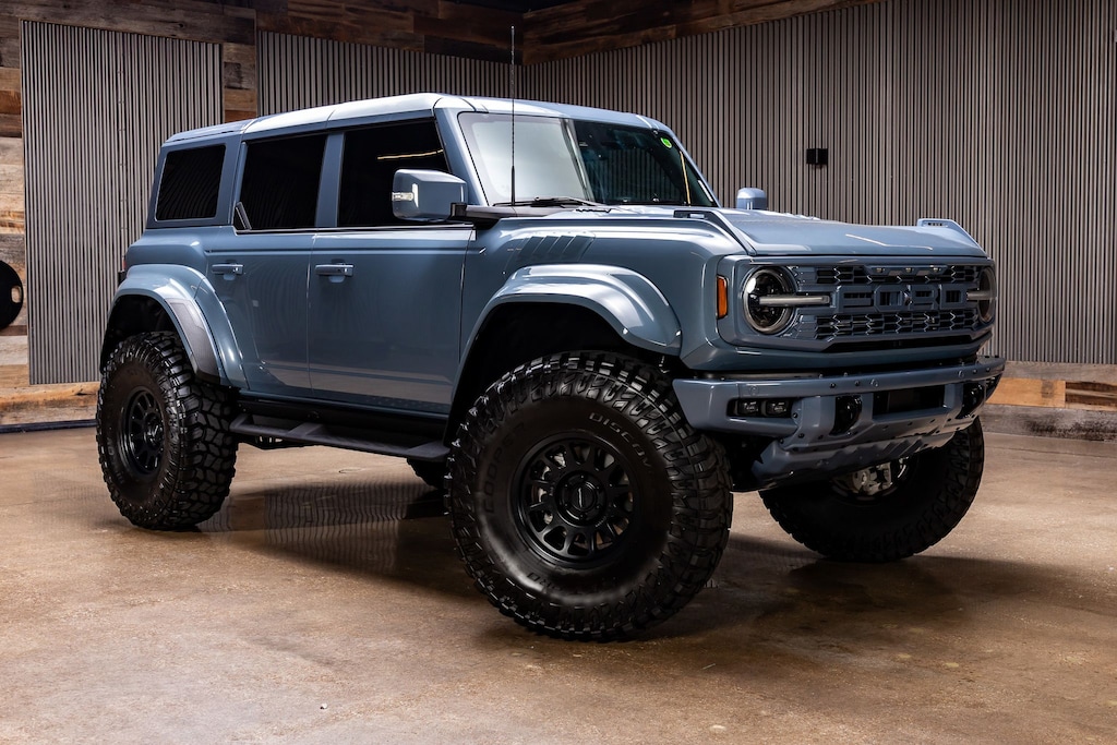 Our One Owner and Clean Carfax 2024 Ford Bronco Raptor 4 Door 4X4 helps raise the bar for remarkably rugged capability in Azure Gray Metallic Tri-Coat! Motivated by a Twin-TurboCharged 3.0 Liter EcoBoost V6 providing 418hp to a 10 Speed Automatic transmission tuned for trail use. Trail Control, a HOSS 4.0 suspension, FOX Live Valve dampers, and electronic locking axles help you leave civilization in your rearview mirror, and this Four Wheel Drive SUV sees nearly 16mpg on the highway. Our Bronco also shows off its bold confidence with heavy-duty bash plates, rock rails, LED lighting, removable top/doors, a unique Raptor hood, bolt-on fenders, running boards, and a heavy-duty modular front bumper with RIGID off-road lighting.