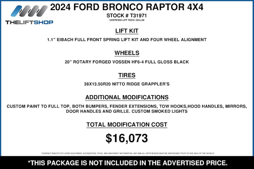 This Lifted 2024 Ford Bronco Raptor 4 Door 4X4 includes a 1.1-inch Eibach Full Front Spring Lift Kit and Four Wheel Alignment, 20-inch Rotary Forged Vossen HF6-4 Full Gloss Black Wheels, 38X13.50R20 Nitto Ridge Grappler Tires, Custom Paint to Full Top, Both Bumpers, Fender Extensions, Tow Hooks, Hood Handles, Mirrors, Door Handles, Grille, and Custom Smoked Lights. Installed by our Certified Lift Tech: Collin! *Modifications are optional and are not included in the advertised price.*