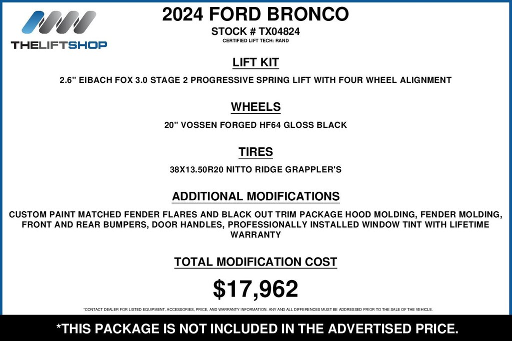 This Lifted 2024 Ford Bronco Raptor features a 2.6-inch Eibach Fox 3.0 Stage 2 Progressive Spring Lift Kit, Four Wheel Alignment, 20-inch Vossen Forged HF64 Gloss Black Wheels, 38X13.50R20 Nitto Ridge Grappler Tires, Custom Paint Match, and Professionally Installed Window Tint with a Lifetime Warranty. Installed by our Lift Tech, Rand. *Modifications are optional and are not included in the advertised price.*