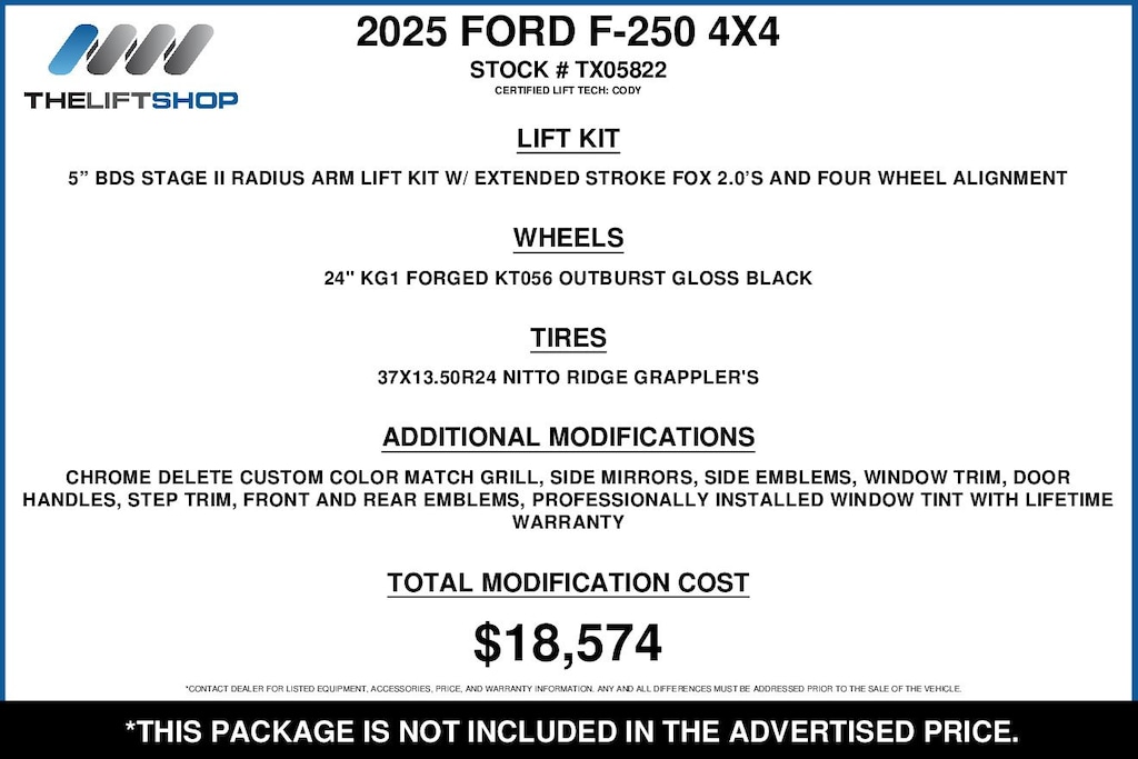 This Lifted 2025 Ford F-250 includes a 5-inch BDS Stage II Radius Arm Lift with Extended Stroke Fox 2.0 Shocks and 24-inch KG1 Forged Outburst Gloss Black Wheels with Nitto Ridge Grappler Tires installed by our Lift Tech Cody! *Modifications are optional and are not included in the advertised price.*