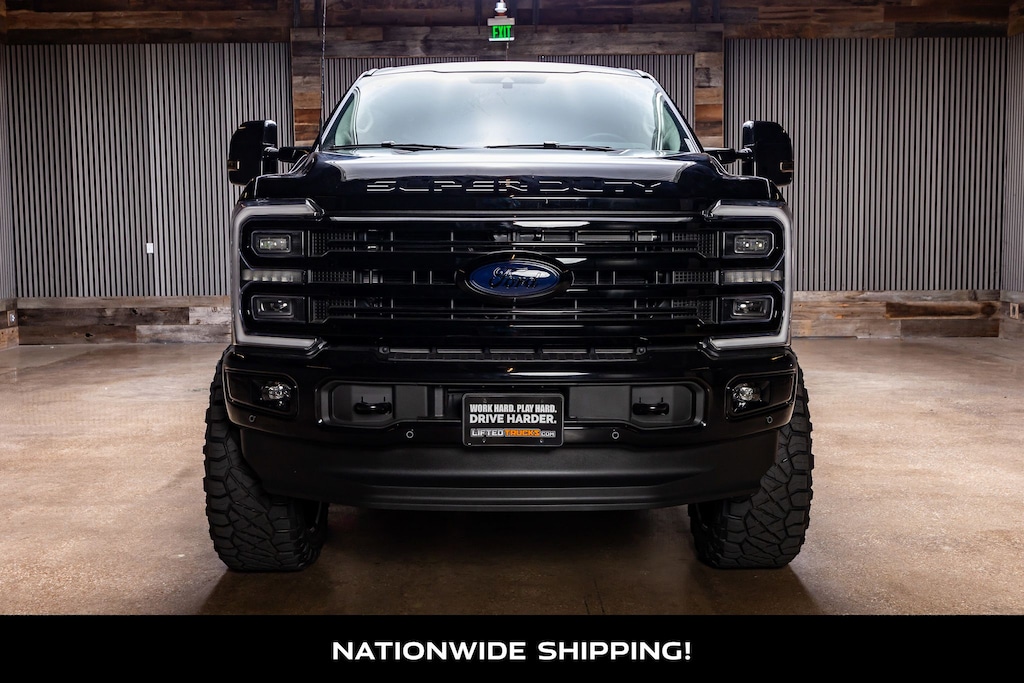 Our Lifted, diesel-powered 2025 Ford F-250 Platinum Crew Cab 4X4 conquers large jobs with lavish luxury in Agate Black Metallic with the Platinum Plus and FX4 Off-Road Packages! Motivated by a TurboCharged 6.7 Liter PowerStroke High Output Diesel V8 supplying 500hp and 1200lb-ft of torque to a 10 Speed Automatic transmission for mighty strength. Features like a Pro Power Onboard generator, built-in payload/trailer-tongue scales, a power tailgate, power running boards, LED lighting, a premium leather topper, a twin-panel sunroof, a unique satin finish grille, satin chrome door handles, and PowerScope mirrors help our Four Wheel Drive F-250 look good and work strong. Our added 5-inch BDS lift, Fox shocks, chrome delete custom color match grille, side mirrors, side emblems, window trim, door handles, step trim, and front/rear emblems, professionally installed window tint, and 24-inch KG1 Forged wheels with Nitto tires stand out in a crowded parking lot.