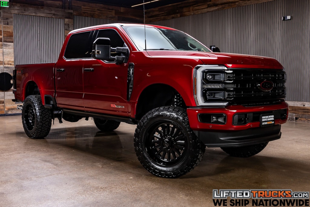 Our One Owner, Diesel-powered 2025 Ford F-250 Platinum Crew Cab 4X4 with the Plus Package conquers large jobs with lavish luxury in Ruby Red Metallic Tinted Clearcoat! Motivated by a TurboCharged 6.7 Liter PowerStroke High Output Diesel V8 supplying 500hp and 1200lb-ft of torque to a 10 Speed Automatic transmission for mighty strength. Features like a Pro Power Onboard generator, built-in payload/trailer-tongue scales, a power tailgate, power running boards, LED lighting, a twin-panel sunroof, 5-inch BDS Stage II Radius Arm Lift Kit w/Extended Stroke Fox 2.0 and Four Wheel Alignment, 22-inch American Force Idol Gloss Black Wheels, 37X12.50R22 Toyo Open Country R/T Trail Tires, Chrome Delete Custom Blackout Grille, Side Mirrors, Side Emblems, Window Trim, Door Handles, Step Trim, Front & Rear Emblems, Professionally Installed Window Tint w/Lifetime Warranty and PowerScope mirrors help our Four Wheel Drive F-250 look good and work strong.