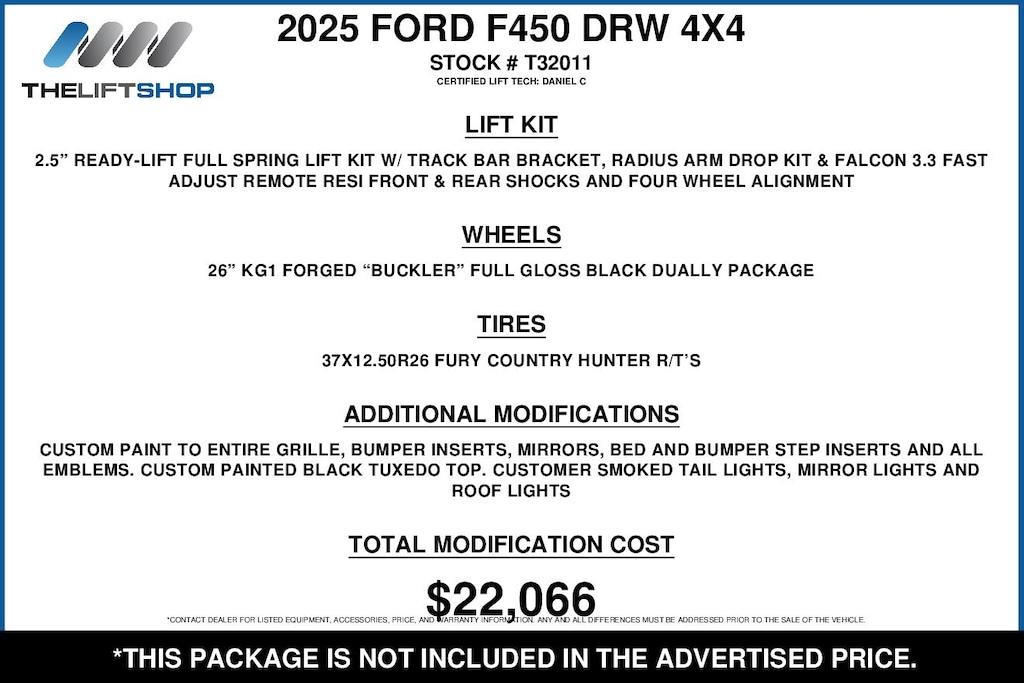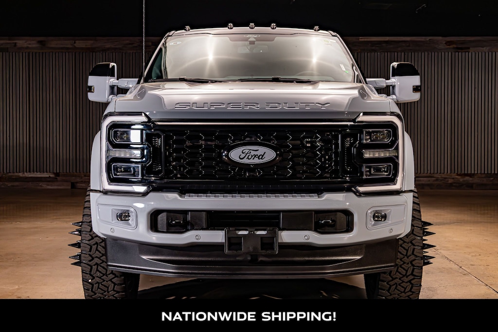 This Lifted 2025 Ford F-450SD Platinum DRW features a 2.5-inch ReadyLift Full Springs Lift Kit with Track Bar Bracket, Radius Arm Drop Kit, Falcon 3.3 Fast Adjust Remote Resi Front & Rear Shocks, Four Wheel Alignment, 26-inch KG1 Forged Buckler Full Gloss Black Wheels, 37X12.50R26 Fury Country Hunter R/T Tires, Custom Paint Match, a Custom Painted Black Tuxedo Top, and Custom Smoked Tail Lights, Mirror Lights, and Roof Lights. Installed by our Lift Tech, Daniel C. *Modifications are optional and are not included in the advertised price.*