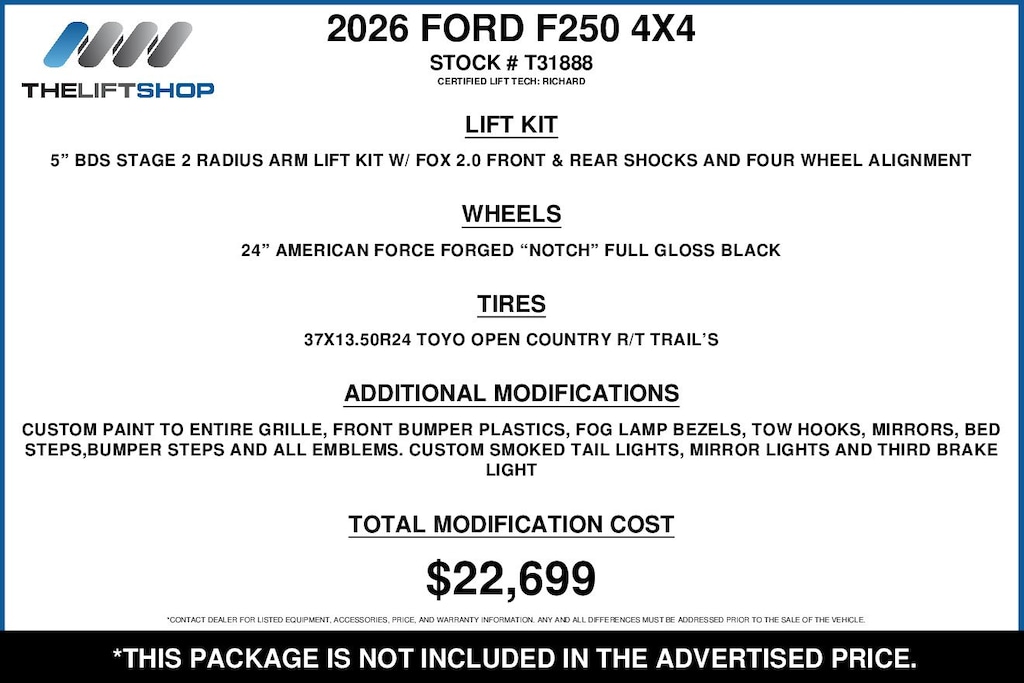 This Lifted 2026 Ford F-250 Platinum Crew Cab 4X4 includes a 5-inch BDS Stage 2 Radius Arm Lift Kit w/Fox 2.5 Elite Series Remote Resi Front & Rear Shocks and Four Wheel Alignment, 22-inch American Force Forged "Notch" Full Gloss Black Wheels, 37X13.50R22 Nitto Ridge Grappler Tires, Custom Paint to Front Bumper, Bed and Step Inserts, Grille, Mirrors, and All Emblems, Custom Painted Tuxedo Top, Custom Smoked Tail Lights and Mirror Lights. Installed by our Certified Lift Tech: Richard! *Modifications are optional and are not included in the advertised price.*